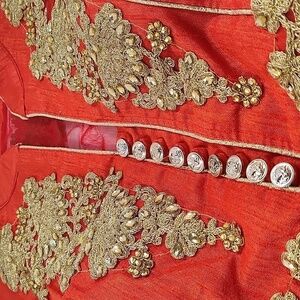 Red & Gold Embroidered High-Low Dress duster – Elegant Party & Wedding duster - This gorgeous red and gold embroidered dress duster is a showstopper! The vibrant red bodice features gold floral detailing, cap sleeves, and a flattering high-low hemline that flows beautifully with every step. The sheer golden overlay adds a touch of luxury, making it ideal for weddings, festive occasions, or elegant parties.
