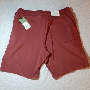 Soft red Knit shorts two deep pockets in front and one pocket in the back hits above knee adjustable drawstring waist relaxed through hip an thigh