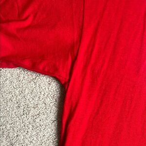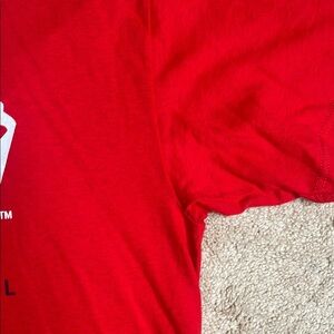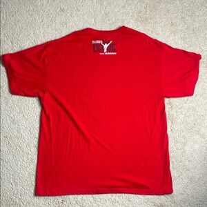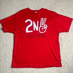 Bold red t-shirt featuring a graphic with a peace hand sign and text. Ideal for casual outings.