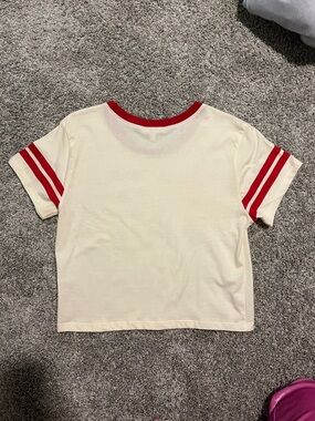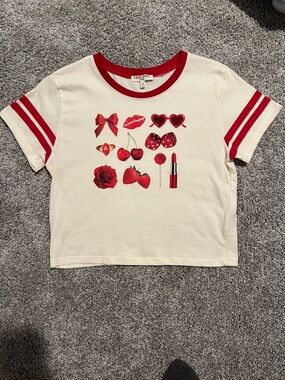 Soft cream ringer tee with bright red accents. Features playful red icons including bows, hearts, cherries, strawberries, and lipstick. Comfortable cotton-blend fabric with red sleeve stripes and neckline. Easy-to-wear style that pairs well with jeans or skirts.