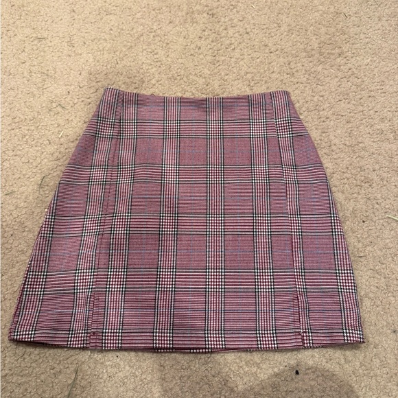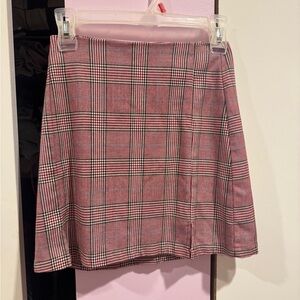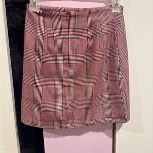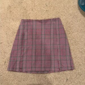 This chic mini skirt features a stylish pink and gray plaid pattern, perfect for both work and casual occasions. Its A-line silhouette offers a flattering fit, while the tailored construction ensures a polished look. Crafted from a woven fabric, this skirt combines comfort with timeless style.