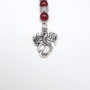 Handmade keychain with red & gray glass beads and silver-toned dragon charm. Made with stainless steel findings.