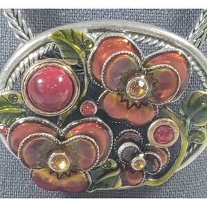 red green butterfly floral, pendent, amber stones inset, wheat chain, lobster clasp, beautiful detail, silver tone chain