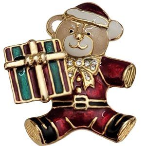 Elevate your style, and make a striking statement this Christmas Holiday by wearing this Teddy Bear Trembler Pin Brooch. A lovely pin that features a Teddy Bear wearing a Santa costume and holding a gift that shakes with movement. Delicately enamel details of green, red, and white Santa costume and hat, gift, and features. The bow on his shirt is exquisitely decorated with clear rhinestones. It measures approximately 1.6 inches in length. This pin is unsigned, but it is as pleasing as any Designer-style costume jewelry. The back of this brooch has a secure locking pin that is easy to fix on the back and can be firmly attached to any fabric surface.
