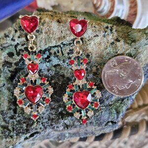 This is a Gorgeous pair of Red & Green HEART Blingy Earrings. The Green stones are cut Baquette Style. Gold-tone hardware. Push-back post Dangle Earrings. These EARRINGS are N-O-T Heavy and hang nicely on the earlobes.
