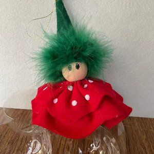 Handmade, brand new polka dot girls ornament! 100% Red and white polka dot dress, hand painted face, handmade boa with handmade hat that contains a bell. Comes with gold string to hang on. Measures approx 4” wide. Comes from smoke free home.