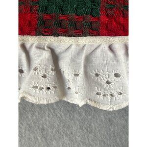This elegant tea towel features a classic red and green checkered pattern, hand accented with intricate Battenburg lace and decorative buttons. The eyelet ruffle trim adds a touch of vintage charm. Crafted from high-quality cotton in a waffle weave texture, it's both functional and decorative.