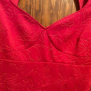 Form-fitting Guess dress in red with sweetheart neckline, subtle rose print etching, flattering ruching, cut out back. Back zipper and buttons at back of neck. 34" from shoulder to hemline. Excellent pre-worn condition.