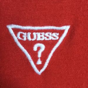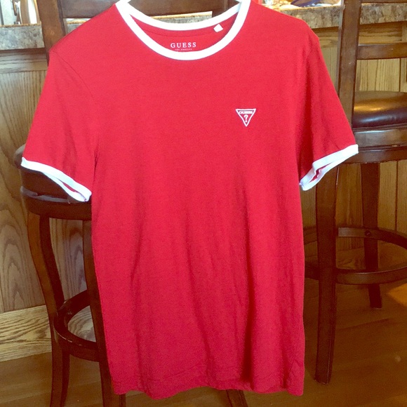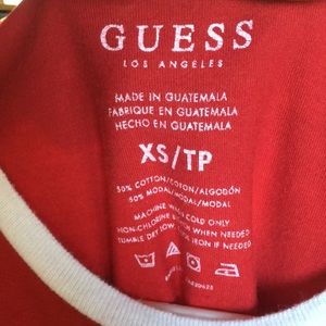 Vintage look Guess logo ringer tee. Red with white contrast cuffs and logo on left breast. Very soft and comfortable cotton modal blend. Material is very soft. Size is Men's Extra Small. There is a tiny hole in the front above the hem.