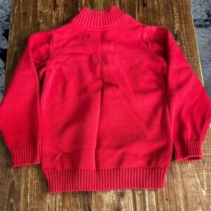 Cozy red half-zip sweater with ribbed cuffs and hem. Perfect for layering.
