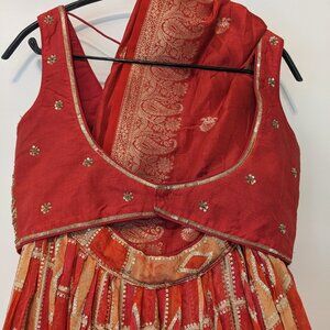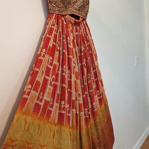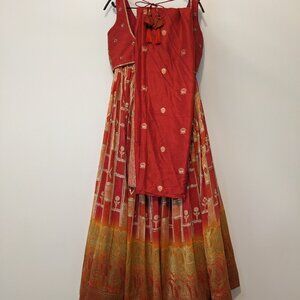 Skirt is 40" long, worn by someone who is 5'4" in 2" heels to still cover the shoe. Tie waist to allow a range of waist circumferences (~28"-38"). Red and orange with champagne/gold sequins and gold foil.