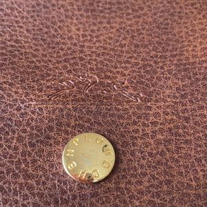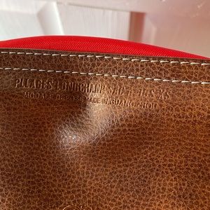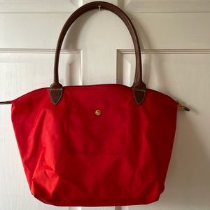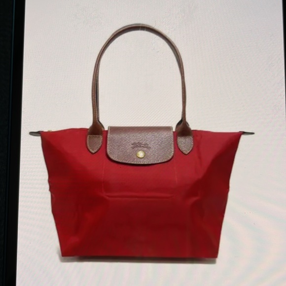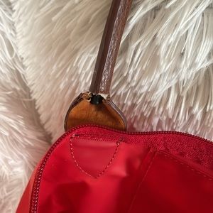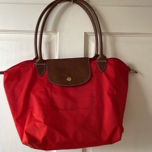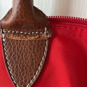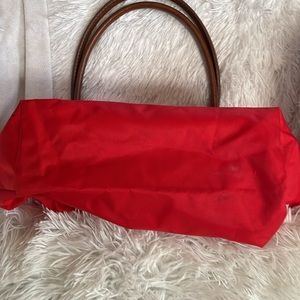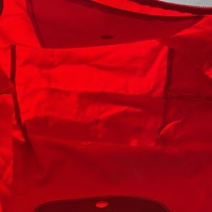 Preowned Red Handbag has minor marks on exterior bottom and one handle has rip