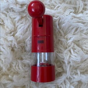 Stylish red handheld grinder with a clear middle section. Easy to use with a manual crank.