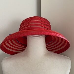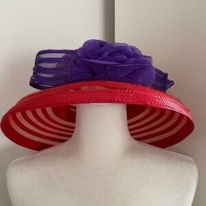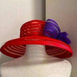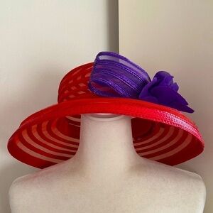 Add a pop of color to your outfit with this elegant red and purple hat. Perfect for special occasions or a stylish day out.
