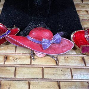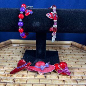 Red Hat Society Jewelry Set With 2 Bracelets & 3 Brooch Pins