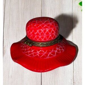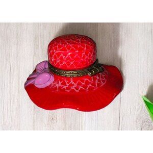 Charming red ceramic trinket box in the shape of a dress hat, featuring a purple bow. Ideal for storing small keepsakes or jewelry.