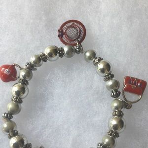 Red Hatters bracelet, silver stretch. 2dangling red hats and 3dangling red purses. Good tight stretch so as not to break. Good condition