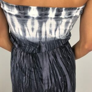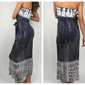 Long Tie Dye Cruise Wear Maxi Dress, Strapless, Loose Flowing Silk Bottom. Will hit around the ankles on a normal height woman. Add a hat. Great Vacation Wear.