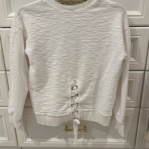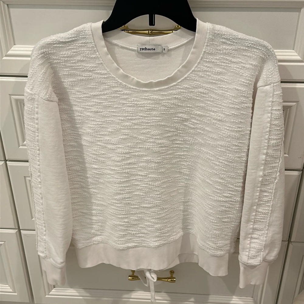 Adorable Red Haute pullover. There are a couple of spots on the sleeves. Not sure how it got there because it’s never been worn. Pictures are showing somewhat darker. Cute detail in the back. Length is about 21”. Pit to pit is about 18”.