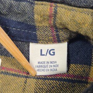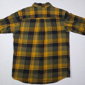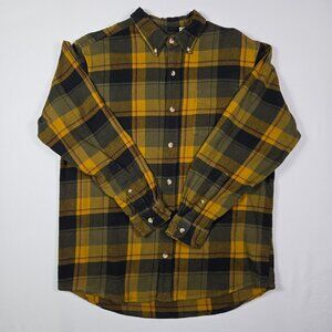 Stay cozy and stylish with this Red Head Brand Co. men’s long sleeve plaid flannel shirt in size L. Featuring a classic mustard yellow, olive, and black plaid pattern, this soft 100% cotton flannel is perfect for layering during cooler seasons. Ideal for outdoor adventures, workwear, or everyday casual style. Pre-owned and in excellent condition.