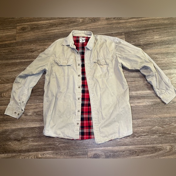 Red Head Brand Co Men's Tan Light Shirt Jacket with Red Plaid Lining Large