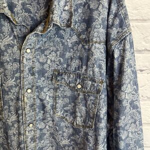 100% cotton, pearl snaps up front of shirt and on sleeve cuffs, paisley style print all over shirt