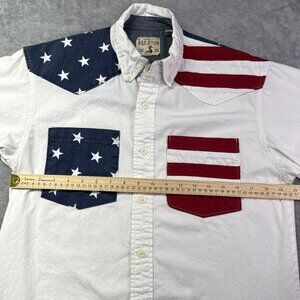 This RedHead men's shirt is a short sleeve button-up featuring a colorblock design with the American flag motif. Made from 100% cotton fabric, it has a collared neckline, a front pocket, and accents like buttons and a logo. The shirt is suitable for travel, parties, or casual wear, and is machine washable. Perfect for all seasons, it showcases a patriotic USA theme and is available in size small.