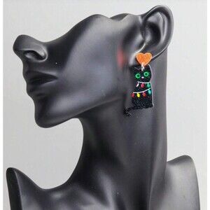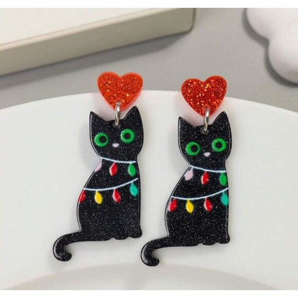 Red Heart Glitter Black CAT with Christmas Lights Wrapped Around