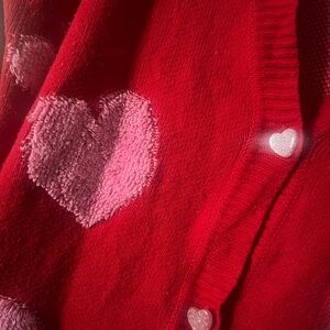 Cozy up in this charming red sweater adorned with playful pink heart patterns. Perfect for adding a touch of fun to your wardrobe.