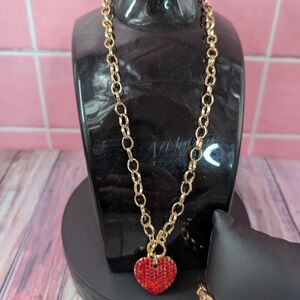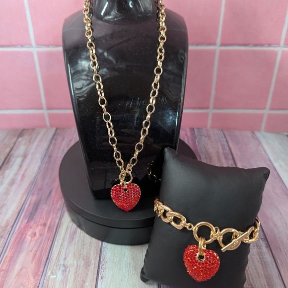Gold necklace and bracelet set with heart charm. Red rhinestone all over the heart charms.
