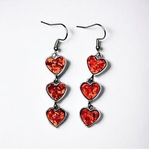 Red Heart Trio Glittery Red & Silver Dangle Earrings Valentine’s Day Nwt