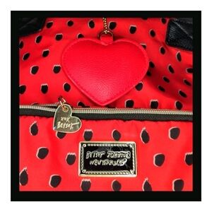 Betsey Johnson red black backpack purse combination. Y2K school academia teacher kids gym travel casual boho. Black purse straps, black shoulder straps, black bottom, black animal polka dots, gold zipper and charm, a little red heart charm. 100% polyester. Width 12", height 14", depth 5". Front outer zipper pocket, inner zipper pocket, two additional inner pockets, two side water bottle pockets. Good condition, thanks for looking..