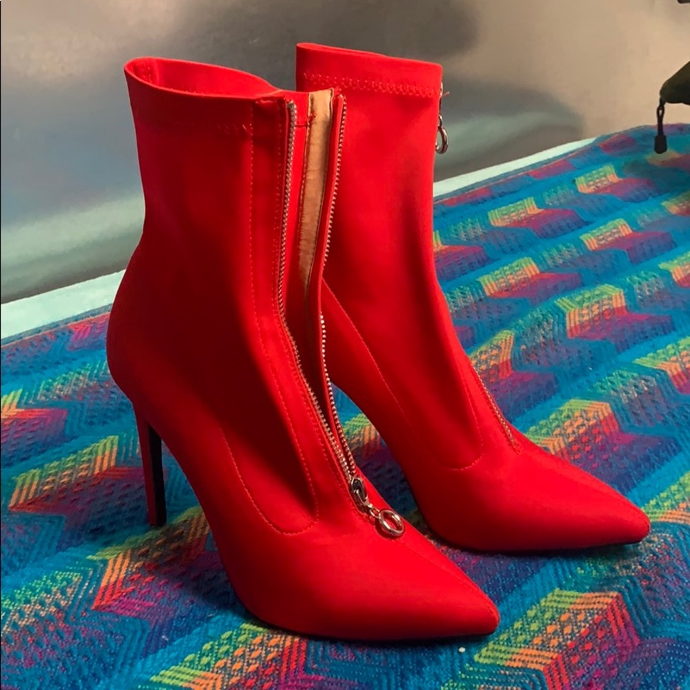 Size 5 red heels. I’m usually size 7 in heels and they fit me perfect. I love them but they are a little too tall for me.
