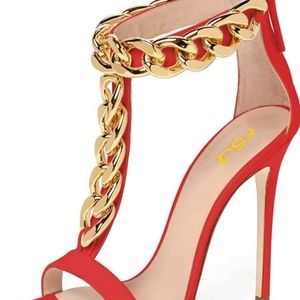 Never worn FSJ Women Golden Open Toe Ankle Straps Sandals High Heels Pumps Stilettos T-Straps Metal Chains Dress Shoes Size 10 US