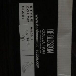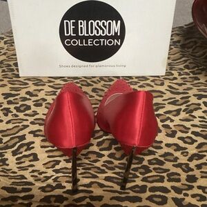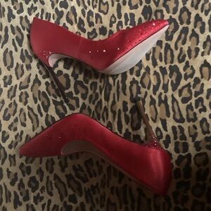 Red satin fabric, embellished with red rhinestones. 4" semi-transparent smokey stiletto heel, also embellished with red rhinestones. Size 8. ❤️ Comes in original shoe box.