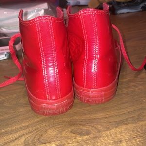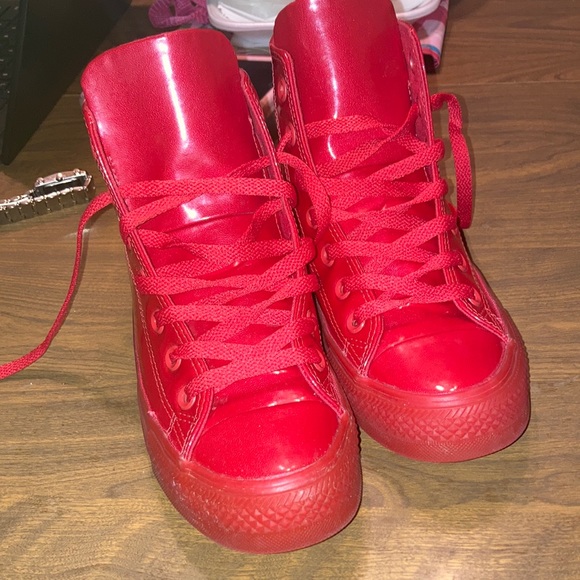 Shiny red high top converse, very rare! Size 5 in men & 7 in women’s. Good used condition.