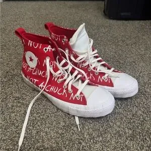 Stylish red high-top' sneakers with white toe cap and laces. Durable canvas upper with bold white graphic text. Comfortable cushioned insole and grippy rubber sole for everyday wear.