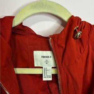Cherry Red Bomber Jacket/Rain Jacket, soft outer material with drawstring hem.