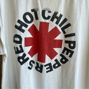 Red Hot chili peppers size extra large 100% cotton T-shirt white with black trim featuring iconic Red Hot chili peppers logo pit to pit 27 inches waist 27 inches length 32 inches