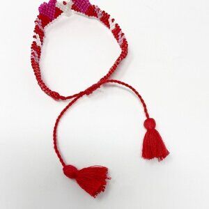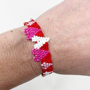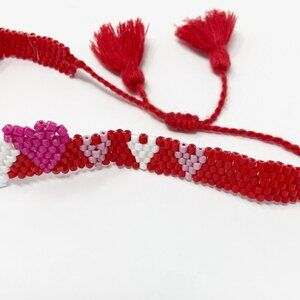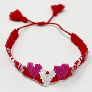 Red Hot Pink White Seed Bead Adjustable Hearts Bracelet