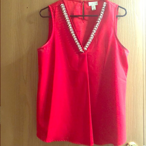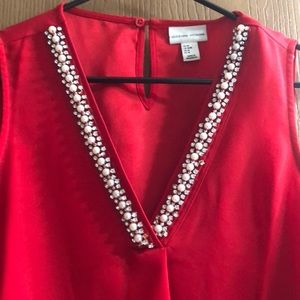 Bright red top with V neck adorned with pearls. Pretty for work or a night out.