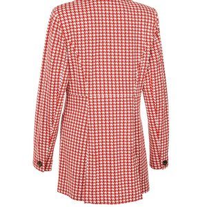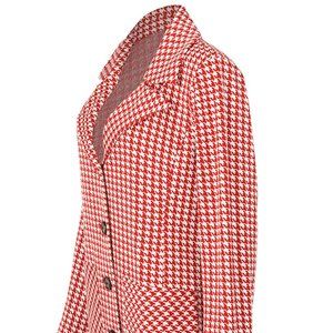This is a beautiful red houndstooth jacket, comes in a fit and flare design with buttons up the front and oversized pockets at the hips. Has a tunic length with a slim fit, a classic double vent at the back and a wide notch collar.