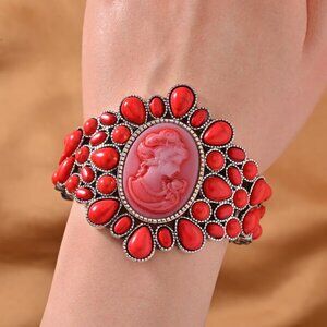 Red Howlite Cameo Bangle Bracelet in Silvertone (7") 26.00 ctw