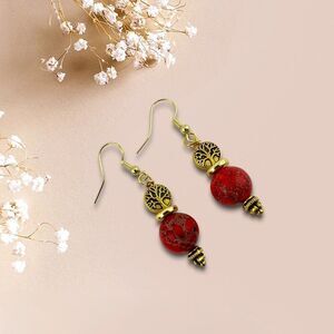 HANDCRAFTED -- earrings of imperial jasper sea sediment stones that drop dangle from gold-plated French hook earwires. About 2" tall. The gemstones are 12mm and topped by a gold-plated tree of life coin bead. Brand new, never worn. Excellent condition.