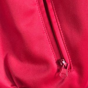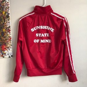 Red running jacket with large word print on back! Only problem is zippers are broken :( but still very much usable!!