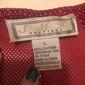 80% leather and 20% rayon. Good shape. Very soft. Crochet lace trim