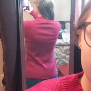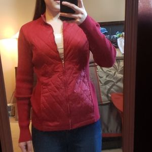 This is a red sweater/light jacket. Very comfortable! I am 5'3" and about 125 pounds for size reference 🙂