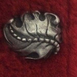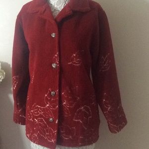 This cozy warm jacket has leaves ALL around, just a small amount half way down back. Silver buttons. XL, side pockets. Gently worn twice.