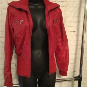 Red Jacket features zipper and pockets. Leather like material. Long sleeves can be cuffed. Jacket has some wear but it’s a gem 💎. This is a absolutely favorite of mine. Sadly I have grown out of it…..