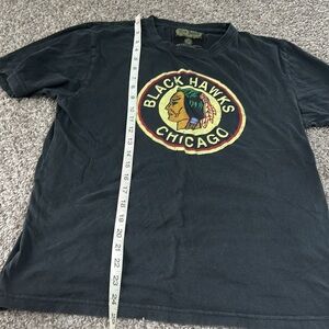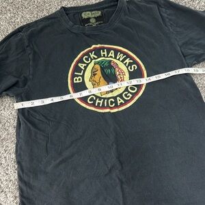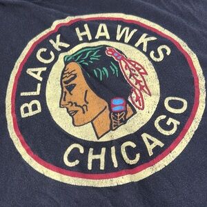 Classic graphic tee featuring the Chicago Blackhawks logo. With a round crew neck and short sleeves, this medium-sized shirt offers a comfortable and casual fit. The prominent Blackhawks logo is printed on the front. This shirt is perfect for showing your team pride at a game, a casual hangout, or while running errands.